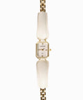 Presenta dos elementos curvos que abrazan la carátula cuadrada, terminando en una fina cadena de eslabones rectangulares.