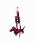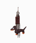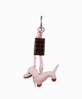 Diseño creativo que combina la figura de un perrito salchicha con un dije de barra de chocolate y correa a rayas.